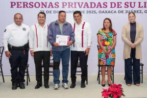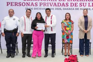 Oaxaca de Juárez, Oax. 23 de diciembre de 2025.- En un acto de justicia social, resultado de un trabajo responsable, profesional y comprometido con las leyes y la dignidad humana; el Gobernador Salomón Jara Cruz entregó de manera simbólica, 6 de 121 constancias de liberación a personas indígenas y de escasos recursos, privadas de su libertad, condenadas por actos menores.
