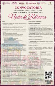 Oaxaca de Juárez, Oax. 4 de diciembre de 2025— El Gobierno Municipal de Oaxaca de Juárez, en coordinación con el Gobierno del Estado, anunció la publicación de la convocatoria 2025 del tradicional Concurso de Figuras de Rábanos, Flor Inmortal y Totomoxtle, una de las celebraciones más emblemáticas de la capital oaxaqueña y parte esencial de la 128 edición de la Noche de Rábanos.
