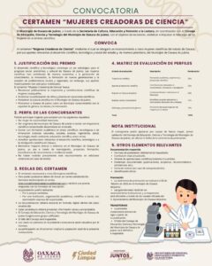 La convocatoria es impulsada a través de la Secretaría de Cultura, Educación y Fomento a la Lectura, en coordinación con el Consejo de Educación, Ciencia y Tecnología del Municipio de Oaxaca de Juárez, y está dirigida a mujeres mexicanas con trayectoria científica comprobable, prioritariamente originarias o con impacto directo en el municipio.